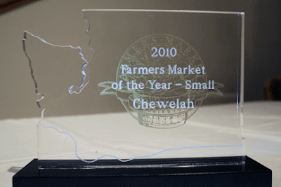 The Chewelah Farmers Market was selected as the Best Small Farmers Market in Washington by the board of the Washington State Farmers Market Association at the 2011 WSFMA Annual Conference held January 28-29 in Leavenworth, WA. The trophy was presented to Chewelah Farmers Market President Nils Johnson by Dan Newhouse, Director of the Washington State Department of Agriculture. “This is very exciting for our market!” said Johnson when accepting the award. Also representing the Chewelah Farmers Market at the conference were Shelly Stevens, Market Promotion; Mary Ann Gehman, Farmers Market Café; and Meadow Plunkett; local grower/vendor. To be nominated for this honor, the farmers market had to be in good standing with the WSFMA, exemplify a high level of connecting farmers to consumers, demonstrate exceptional diligence in representing the best interest of the community and promote and support the WSFMA organization.