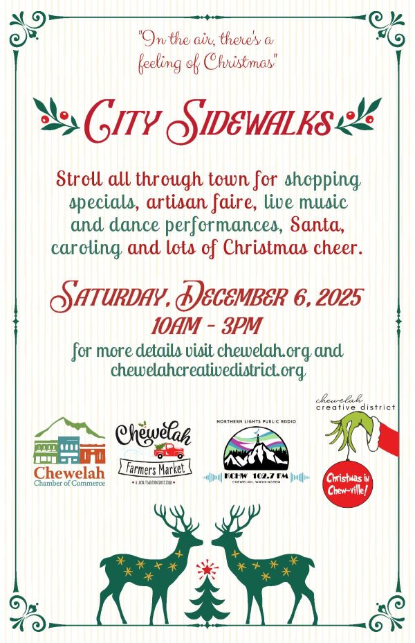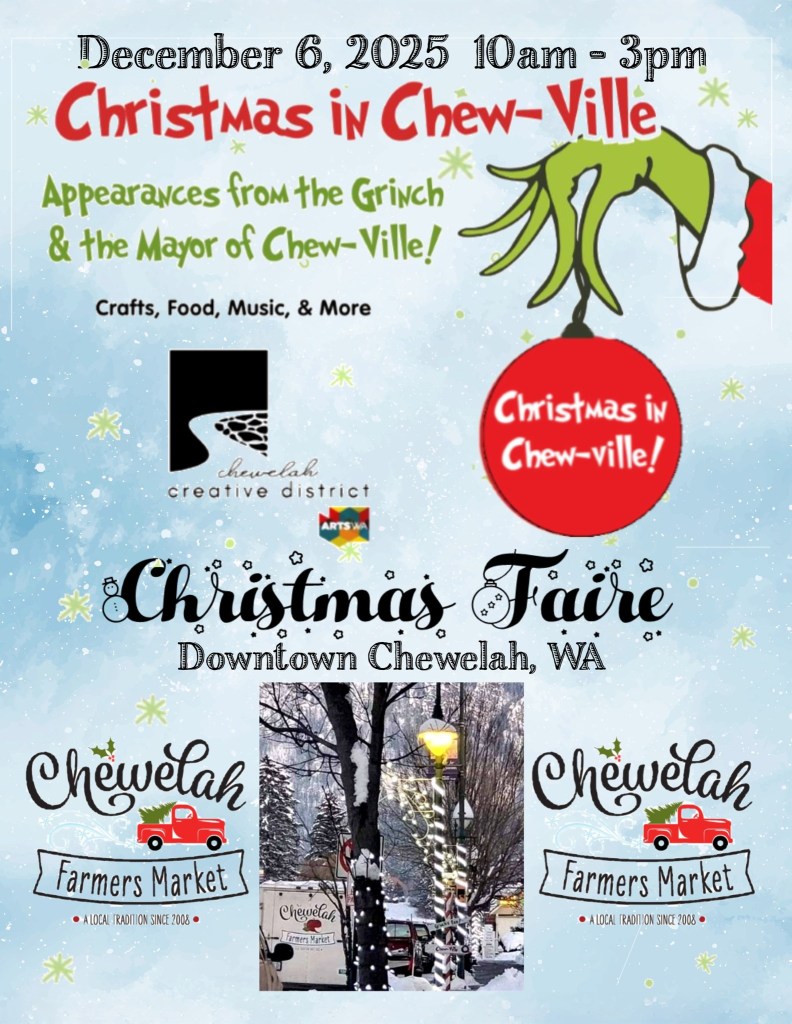 Christmas Faire Saturday, December 6, 2025 10 a.m. – 3 p.m. On Main Ave. in Chewelah Artisans, Food, Music & More! Invite Your Friends on Facebook